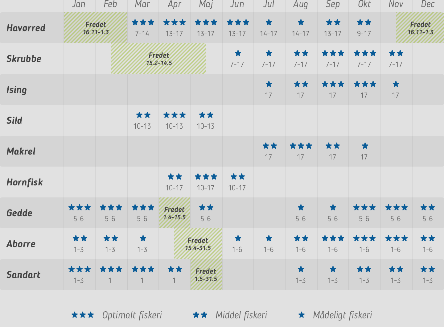 Her kan du se, hvor og hvornår du kan fange de mest udbredte fisk i fjorden.